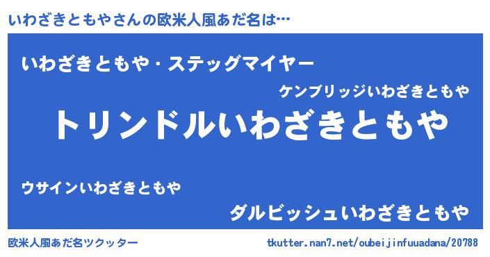 | 男性向けラノベタイトル風あだ名 | 『いわざきともや~年齢イコール彼女いない歴の魔法使い~』 |