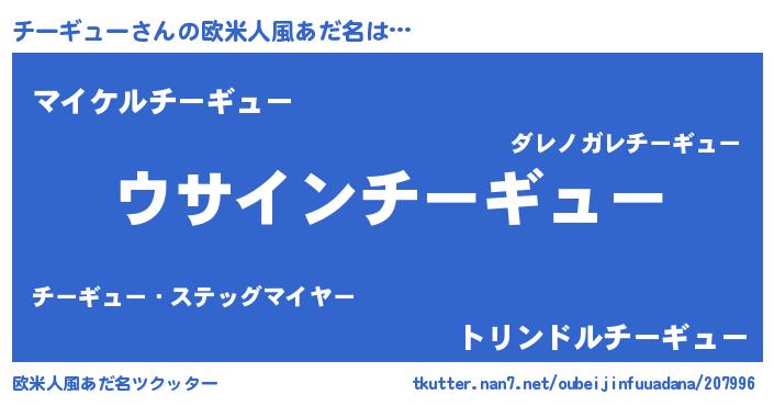 | 男性向けラノベタイトル風あだ名 | 『チーギューの嫁は女の子じゃないと思った?』 |