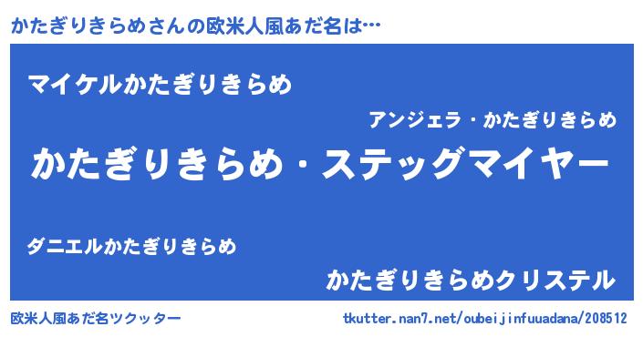 | 男性向けラノベタイトル風あだ名 | 『うちのかたぎりきらめが世界を掌握している!』 |