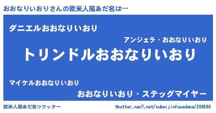 | 男性向けラノベタイトル風あだ名 | 『おおなりいおり~年齢イコール彼女いない歴の魔法使い~』 |