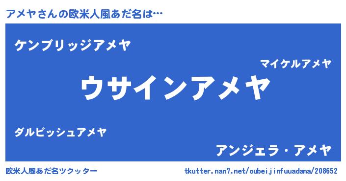 | 男性向けラノベタイトル風あだ名 | 『アメヤの嫁は女の子じゃないと思った?』 |