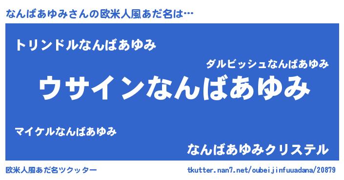 | 男性向けラノベタイトル風あだ名 | 『なんばあゆみの嫁は女の子じゃないと思った?』 |
