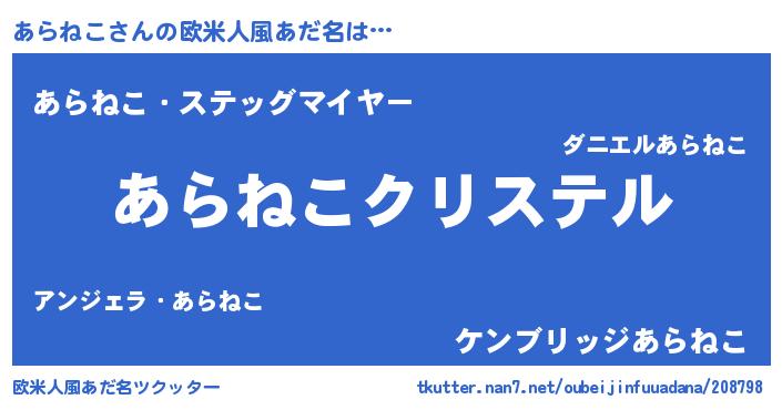 | 女子向けラノベタイトル風あだ名 | 『あらねこ伯爵の花嫁』『闇のあらねこ』 |