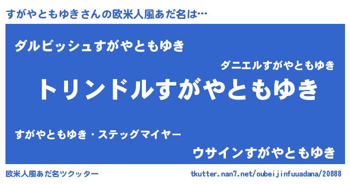 | 胡散臭い通販商品みたいなあだ名 | 『絶対に幸福をもたらす水素水…その名も「すがやともゆき」』 |
