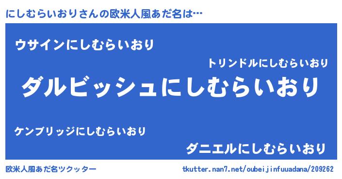 | ヘコむあだ名 | 『にしむらいおり(爆)』『にしお』 |