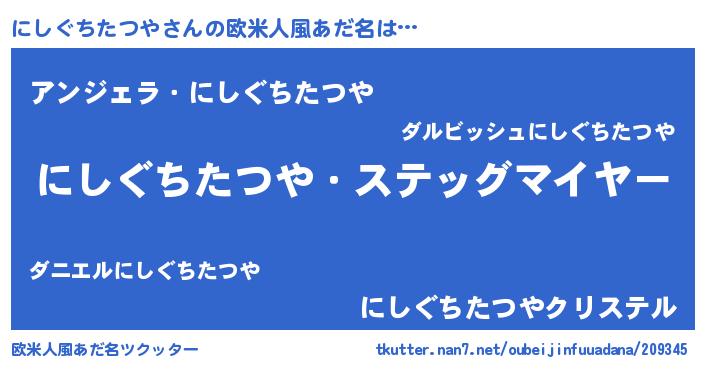 | 男性向けラノベタイトル風あだ名 | 『冴えないにしぐちたつやの育てかた』 |