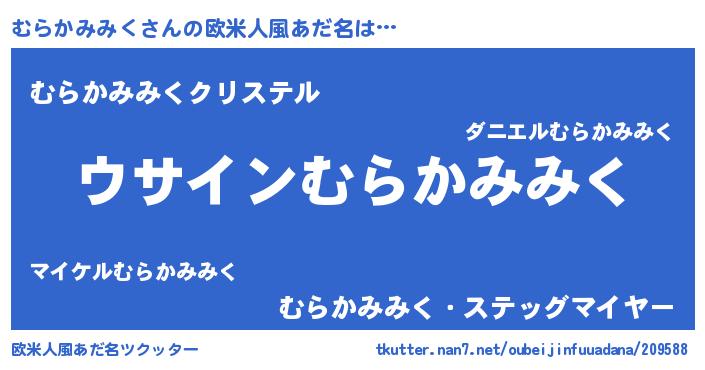 | 女子向けラノベタイトル風あだ名 | 『むらかみみくの卵を拾いまして』 |