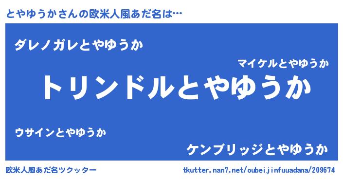 | 男性向けラノベタイトル風あだ名 | 『とやゆうか~年齢イコール彼女いない歴の魔法使い~』 |