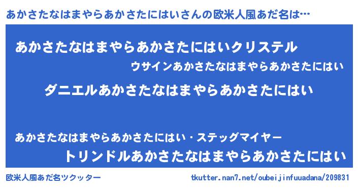 | 男性向けラノベタイトル風あだ名 | 『ノーゲーム・ノーアカサタナハマヤラアカサタニハイ』 |