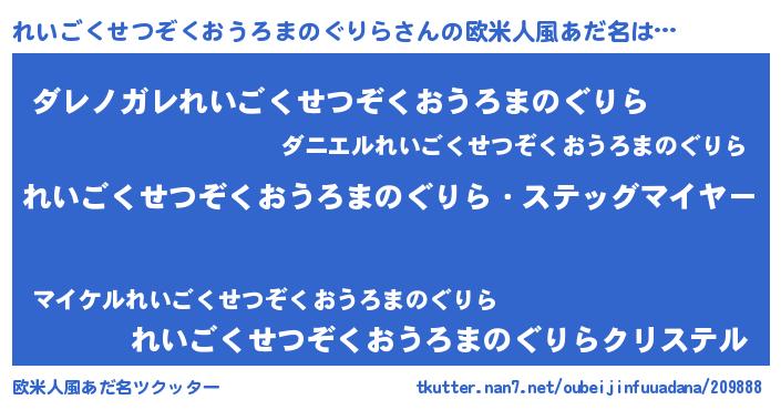 | 意味不明あだ名 | 『住所不定無職れいごくせつぞくおうろまのぐりら(5歳)』 |