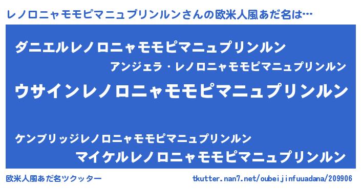| 男性向けラノベタイトル風あだ名 | 『ダンジョンにレノロニャモモピマニュプリンルンを求めるのは間違っているだろうか』 |