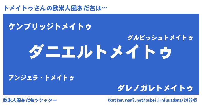 | 男性向けラノベタイトル風あだ名 | 『おまえをオタクにしてやるから、俺をトメイトゥにしてくれ! 』 |