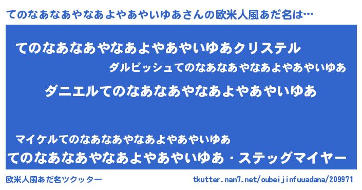 | 男性向けラノベタイトル風あだ名 | 『ノーゲーム・ノーテノナアナアヤナアヨヤアヤイユア』 |