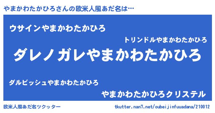 | 男性向けラノベタイトル風あだ名 | 『魔弾の王とやまかわたかひろ』 |
