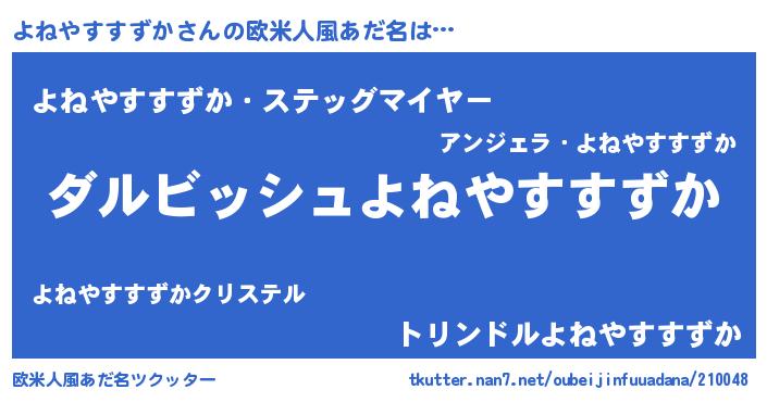 | 男性向けラノベタイトル風あだ名 | 『誰もが恐れるあのよねやすすずかが、ぼくの専属メイドになるようです。』 |