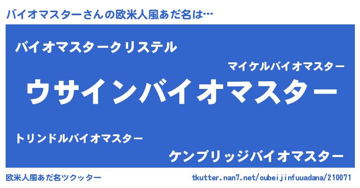 | 男性向けラノベタイトル風あだ名 | 『バイオマスターの嫁は女の子じゃないと思った?』 |