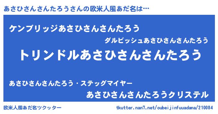| 男性向けラノベタイトル風あだ名 | 『あさひさんさんたろう~年齢イコール彼女いない歴の魔法使い~』 |