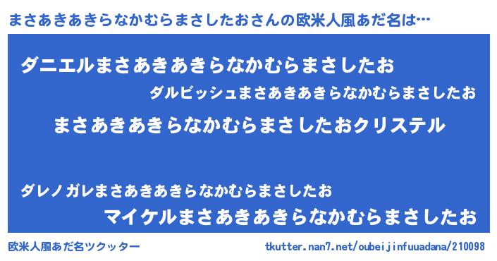 | 男性向けラノベタイトル風あだ名 | 『やはりまさあきあきらなかむらまさしたおの青春ラブコメはまちがっている 』 |