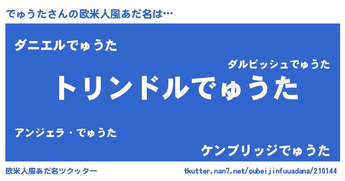 | 男性向けラノベタイトル風あだ名 | 『でゅうた~年齢イコール彼女いない歴の魔法使い~』 |