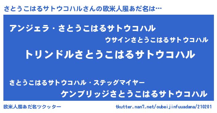 | 男性向けラノベタイトル風あだ名 | 『サトウコハルサトウコハルスレイヤー』 |