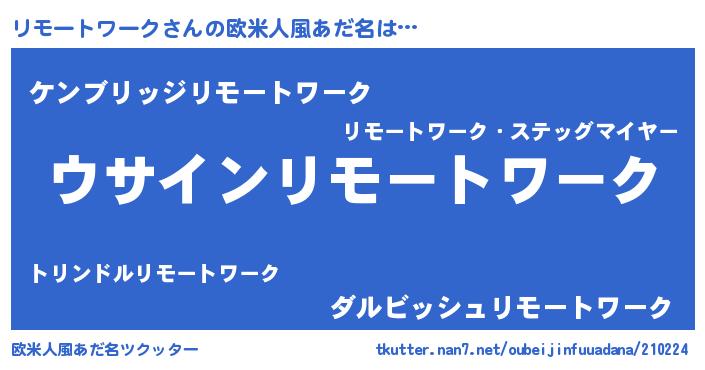 | 男性向けラノベタイトル風あだ名 | 『リモートワークの嫁は女の子じゃないと思った?』 |