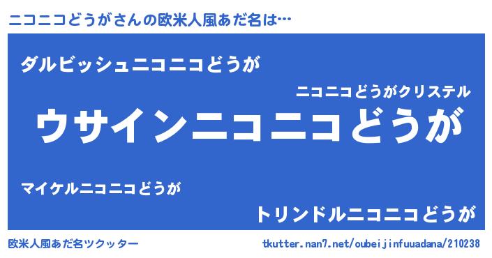 | 男性向けラノベタイトル風あだ名 | 『ニコニコどうがの嫁は女の子じゃないと思った?』 |