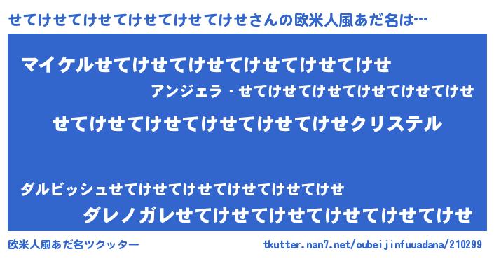 | 男性向けラノベタイトル風あだ名 | 『やはりせてけせてけせてけせてけせてけせの青春ラブコメはまちがっている 』 |