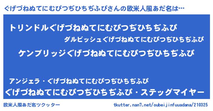 | ヘコむあだ名 | 『ぐげづねぬてにむぴつぢひちぢふぴ(笑)』 |
