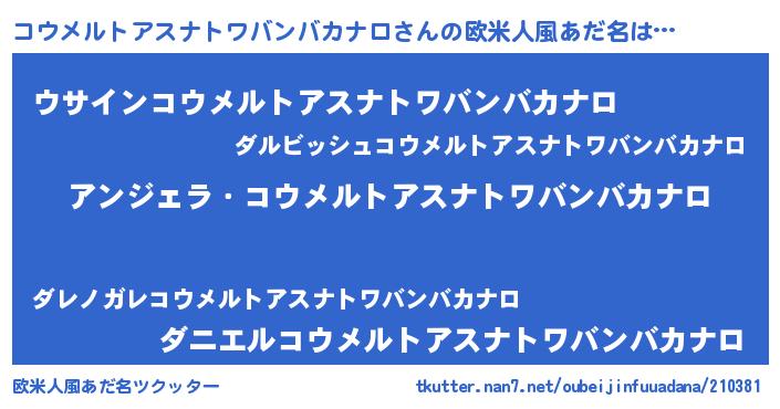 | 男性向けラノベタイトル風あだ名 | 『はたらくコウメルトアスナトワバンバカナロさま!』 |