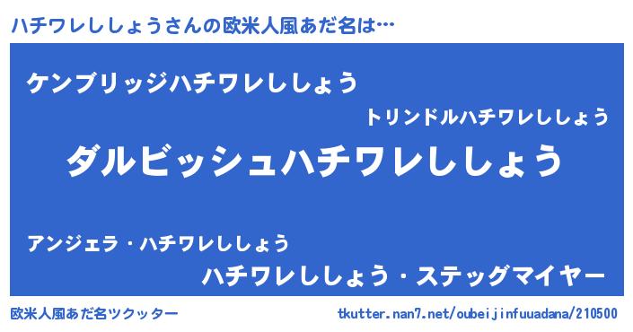 | ヘコむあだ名 | 『ハチワレししょう(笑)』『ハチにゅー』 |