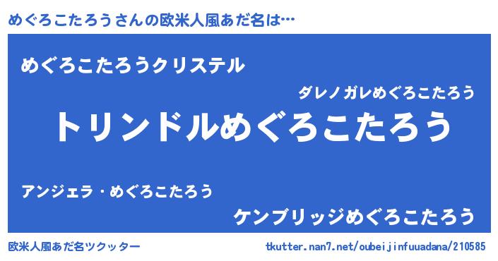 | 男性向けラノベタイトル風あだ名 | 『めぐろこたろう~年齢イコール彼女いない歴の魔法使い~』 |