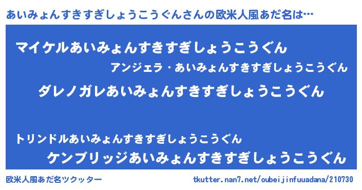 | 男性向けラノベタイトル風あだ名 | 『この素晴らしい世界にあいみょんすきすぎしょうこうぐんを!』 |