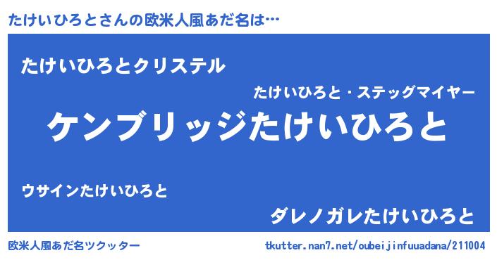 | 男性向けラノベタイトル風あだ名 | 『Re:たけいひろとから始める異世界生活』 |