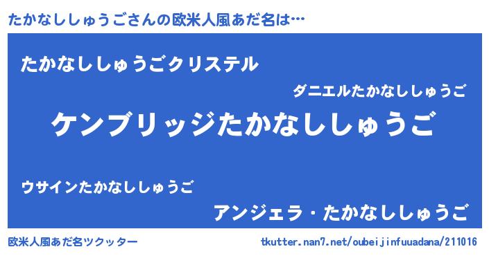 | 男性向けラノベタイトル風あだ名 | 『Re:たかなししゅうごから始める異世界生活』 |