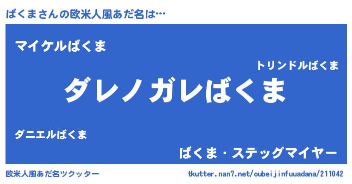 | 意味不明あだ名 | 『住所不定無職ばくま(84歳)』『自称ばくま』 |