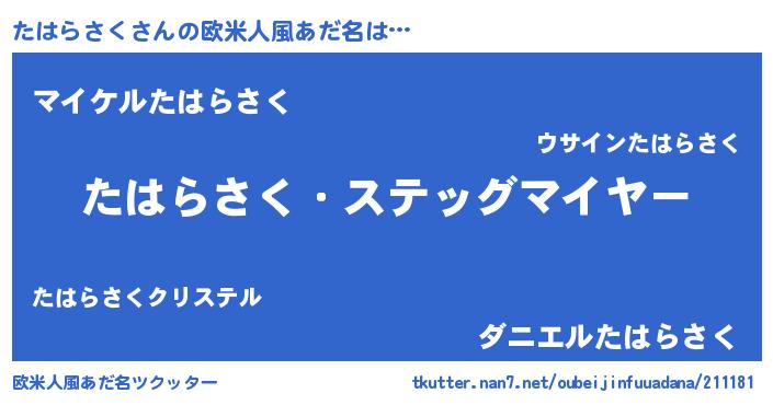 | 男性向けラノベタイトル風あだ名 | 『うちのたはらさくが世界を掌握している!』 |