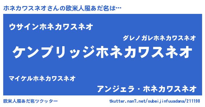 | 男性向けラノベタイトル風あだ名 | 『Re:ホネカワスネオから始める異世界生活』 |