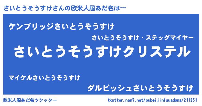 | 男性向けラノベタイトル風あだ名 | 『やはりさいとうそうすけの青春ラブコメはまちがっている 』 |