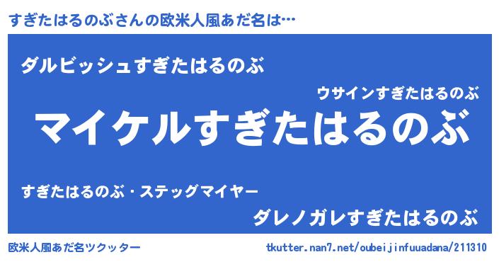 | 男性向けラノベタイトル風あだ名 | 『すぎたはるのぶの憂鬱』 |