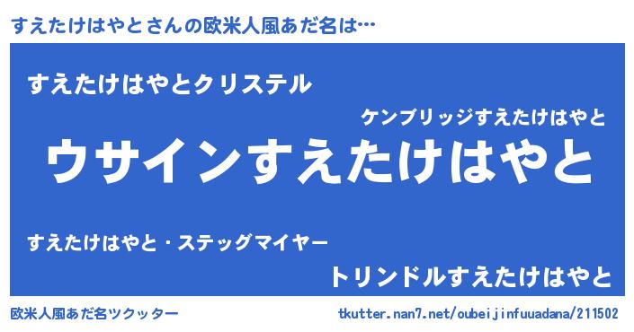 | 男性向けラノベタイトル風あだ名 | 『すえたけはやとの嫁は女の子じゃないと思った?』 |