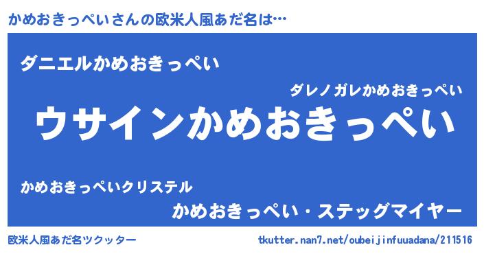 | 男性向けラノベタイトル風あだ名 | 『かめおきっぺいの嫁は女の子じゃないと思った?』 |