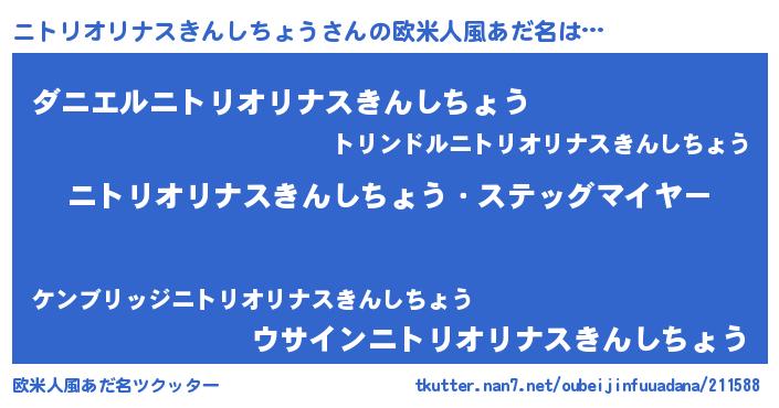 | 男性向けラノベタイトル風あだ名 | 『うちのニトリオリナスきんしちょうが世界を掌握している!』 |