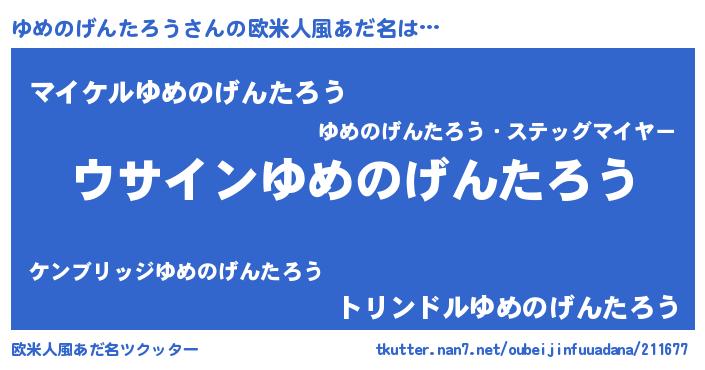 | 男性向けラノベタイトル風あだ名 | 『ゆめのげんたろうの嫁は女の子じゃないと思った?』 |