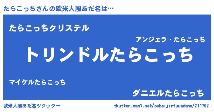 | 女子向けラノベタイトル風あだ名 | 『たらこっちの玉の輿計画!』 |