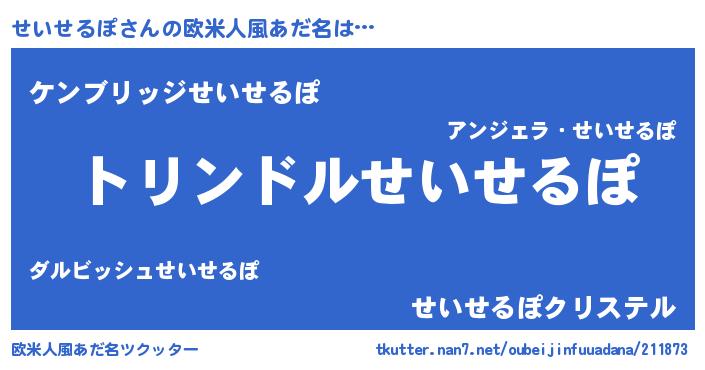 | 女子向けラノベタイトル風あだ名 | 『せいせるぽの玉の輿計画!』 |