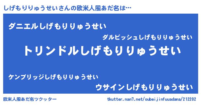 | 男性向けラノベタイトル風あだ名 | 『転生したらしげもりりゅうせいだった件』 |