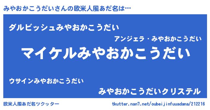 | 男性向けラノベタイトル風あだ名 | 『みやおかこうだいの憂鬱』 |