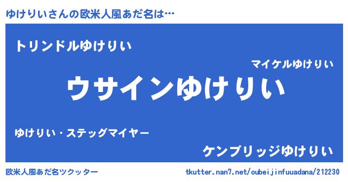 | 女子向けラノベタイトル風あだ名 | 『ゆけりいの卵を拾いまして』 |
