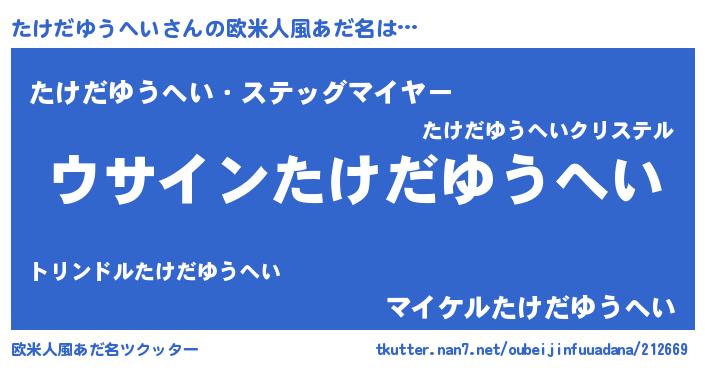 | 男性向けラノベタイトル風あだ名 | 『たけだゆうへいの嫁は女の子じゃないと思った?』 |