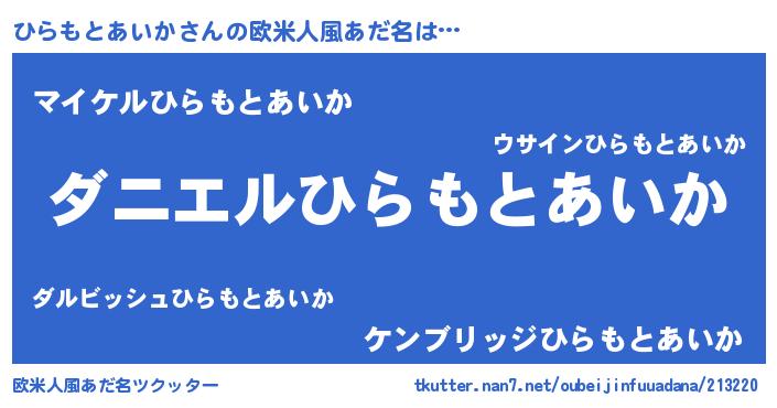 | 男性向けラノベタイトル風あだ名 | 『おまえをオタクにしてやるから、俺をひらもとあいかにしてくれ! 』 |